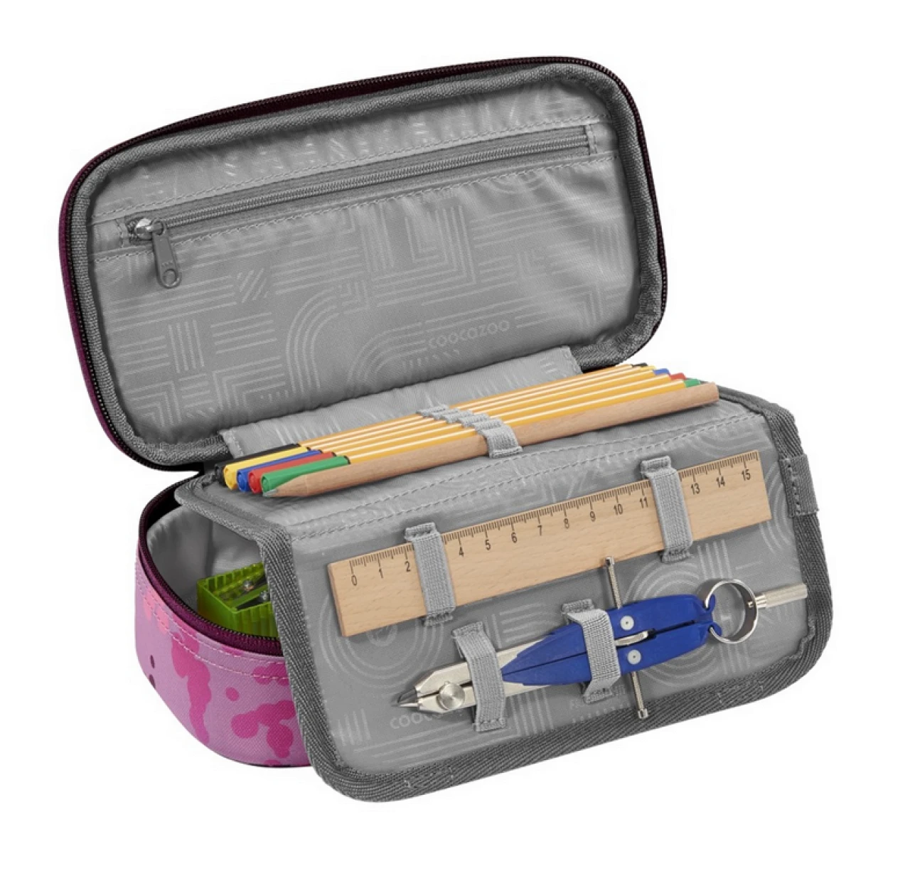 Alles andere als „schlampig“: Im Schulmäppchen geht so schnell nichts mehr verloren – Stifteorganizer und extra Fächer für Stundenplan, Geodreieck und Zirkel halten alles aufgeräumt an seinem Platz. In den Stiftschlaufen im Inneneinteiler sind die wichtigsten Stifte von Füller bis Bleistift sofort griffbereit. Im Stundenplanfach hat dein Kind direkten Überblick, was als nächstes kommt. Das große Hauptfach bietet genügend Platz für Spitzer, Schere, Klebestift und Lineale, kleinere Utensilien wie Tintenpatronen oder Kleingeld sind im Reißverschlussfach sicher aufgehoben. So ist dein Kind perfekt ausgestattet – ob für Schulaufsätze oder den Kunstunterricht.