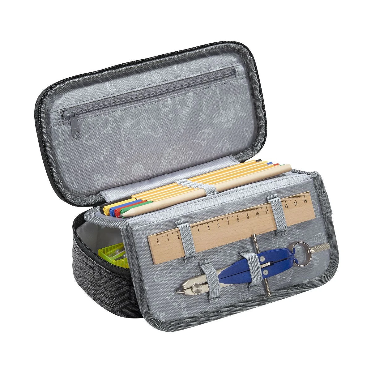 Alles andere als „schlampig“: Im Schulmäppchen geht so schnell nichts mehr verloren – Stifteorganizer und extra Fächer für Stundenplan, Geodreieck und Zirkel halten alles aufgeräumt an seinem Platz. In den Stiftschlaufen im Inneneinteiler sind die wichtigsten Stifte von Füller bis Bleistift sofort griffbereit. Im Stundenplanfach hat dein Kind direkten Überblick, was als nächstes kommt. Das große Hauptfach bietet genügend Platz für Spitzer, Schere, Klebestift und Lineale, kleinere Utensilien wie Tintenpatronen oder Kleingeld sind im Reißverschlussfach sicher aufgehoben. So ist dein Kind perfekt ausgestattet – ob für Schulaufsätze oder den Kunstunterricht.